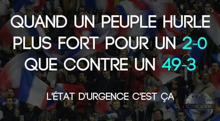 Et j’aimerais qu’on arrête de s’emparer du mot « peuple » comme ça. Les gens qui font les débiles dans la rue à la suite de la victoire de leur équipe de Ken (de chez Ken et Barbie hein, je dis ça car les sportifs ont peu de culture, c’est bien connu) ne sont pas « le peuple » et, scoop, sont, dans d’autres circonstances, capables de s’exprimer autrement que par des borborygmes. « Un peuple » est tout aussi capable de manifester contre une loi inique que gueuler « BUUUUT ». Mais c’est follement classe, peuple. Ça te renvoie à ta conscience : comment oses-tu, toi, petite merde, éprouver un plaisir populaire quand le monde s’écroule en flammes ? C’est pas comme si tu t’étais indigné avant, pas comme si tu faisais la fête un soir, ponctuellement.