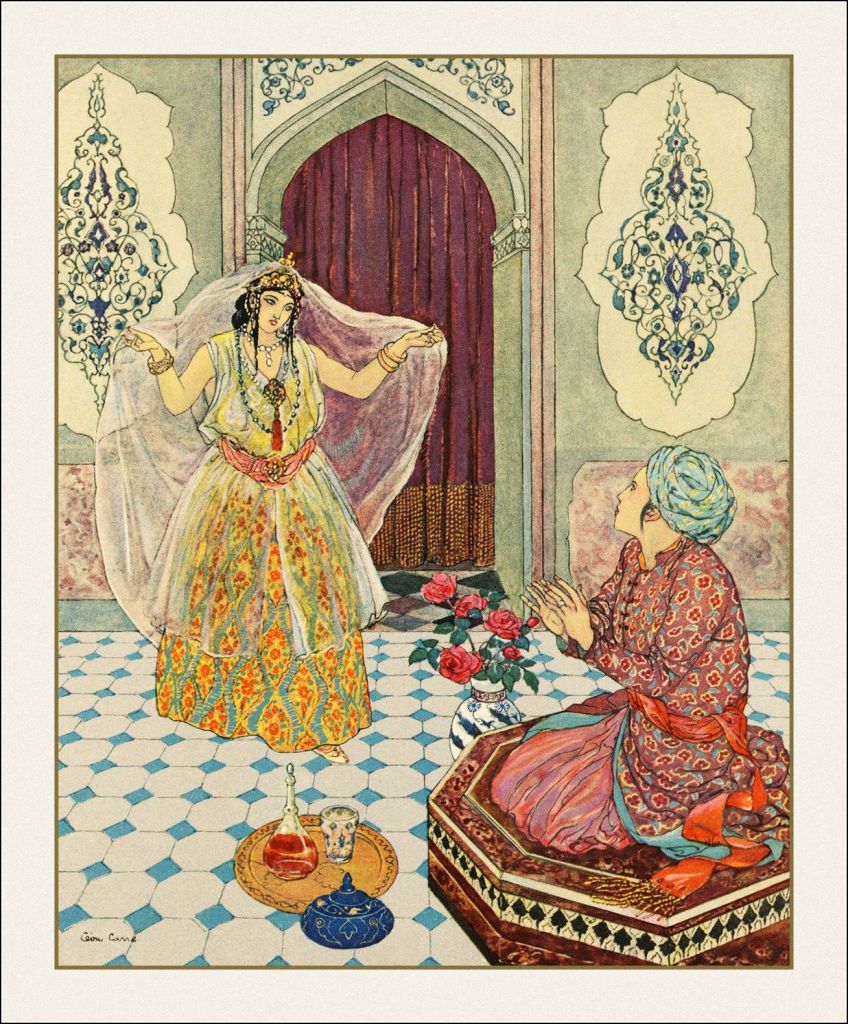 J’enseigne depuis trois ans l’histoire de Parizade, jeune princesse des Mille et Une Nuits, sauvant ses frères d’une malédictions. Parce que les cinquièmes apprécient ce conte, que je l’ai trouvé dans un manuel assez chouette, et qu’il y a plein d’approches possibles.